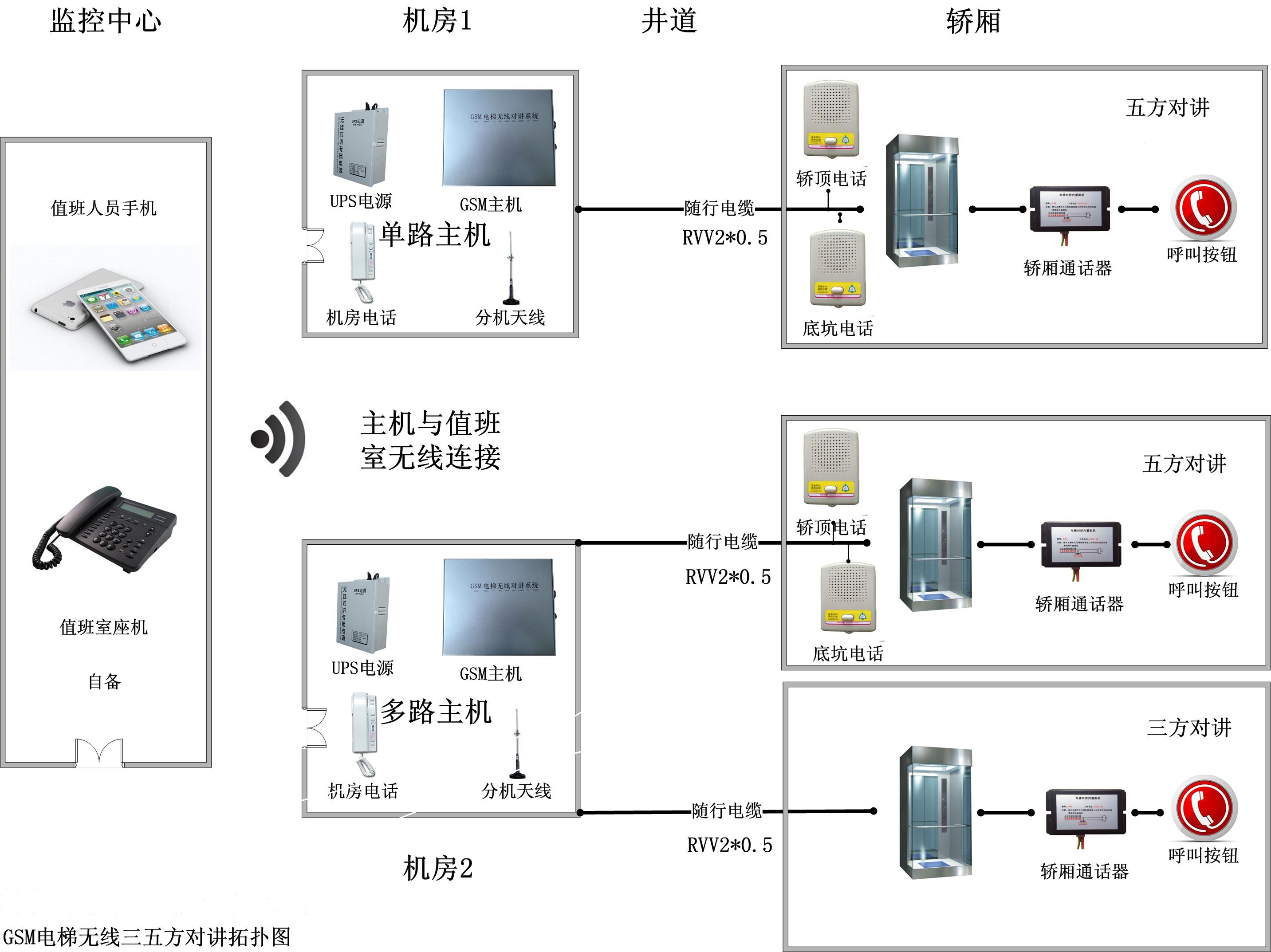 安裝方法:將電梯無線對講主機(jī)安裝在電梯機(jī)房。首先使用劃線器標(biāo)出安裝位置,用電鉆鉆孔,將螺栓把主機(jī)固定好。最好安裝在離門窗近的地方方便無線信號的接收和發(fā)射,把12V-UPS電源插在電源接口上,打開電源,看電源燈是否已變亮,看主機(jī)側(cè)面電源燈是否變亮,變亮表示主機(jī)已處于正常工作狀態(tài),把機(jī)房電話接入電話接口處,最后再插入控制線到通話器接口上,把控制線上的兩條(黃綠)線接入準(zhǔn)備好的兩條隨行電纜上,這時機(jī)房設(shè)備已全部安裝完備(注:每臺主機(jī)可接三臺電梯)。